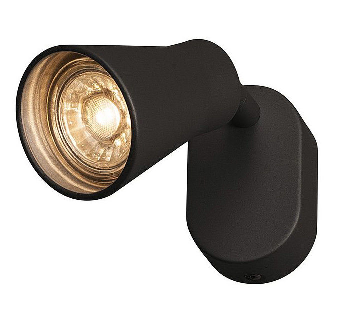 Nástěnné nebo stropní bodové svítidlo, nastavitelný směr svícení, těleso ocel, povrch černá/bílá/šedá, pro žárovku 1x50W, GU10, 230V, IP20, tř.1, rozměry tělesa 50x115x95mm, rozměry hlavice d=62mm.