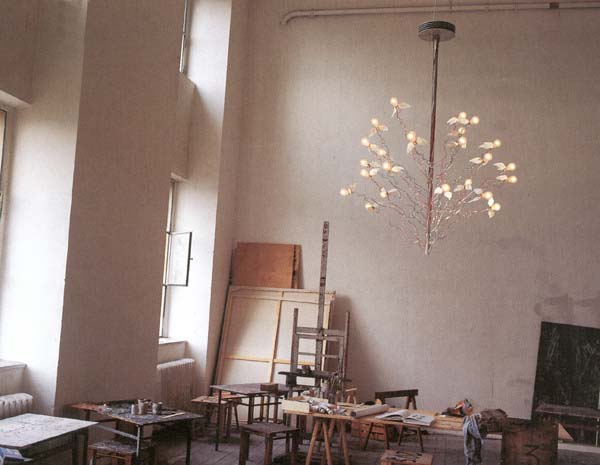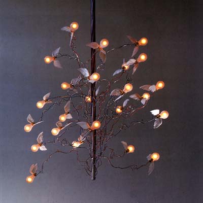 BIRDS BIRDS BIRDS - Závěsné svítidlo lustr, vodiče v barvě červená a modrá, u žárovek dekorativní křidélka husí peří, 24x10W, E27, 230V/12V, IP20, rozměry cca 1200x1300mm, závěs l=1900 cm