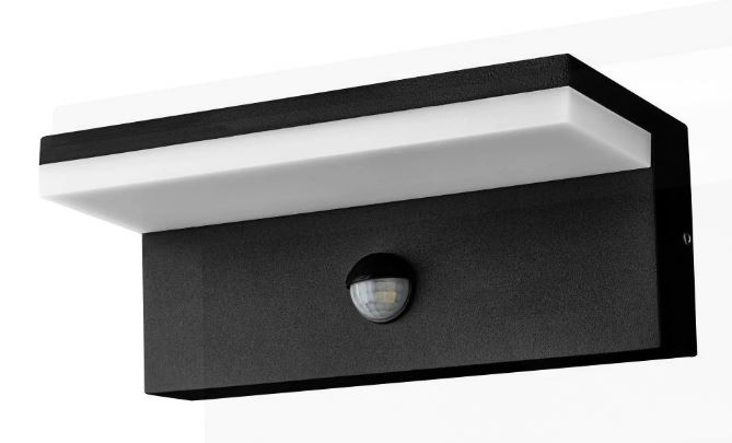 BLUES 9W CCT PIR - Nástěnné venkovní svítidlo, PIR senzor, záběr 110°, dosah 12m, čas 10s-5min, kov, černá, dif plast opál, LED 9W, 720lm, přepín CCT teplá 3000K-neutrální 4000K, 230V, IP54, rozměry 200x85mm, svítí dolů