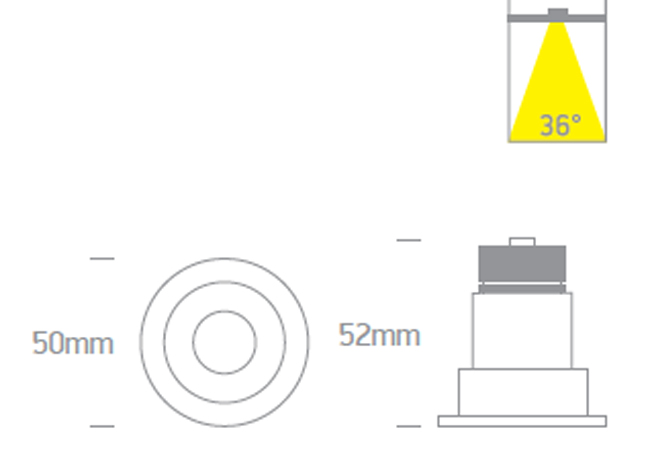 Stropní podhledové, bodové, svítidlo, těleso kov, rámeček bílá/černá, reflektor černá/mosaz/bílá, LED 3W, 240lm, teplá 3000K, stmív, vyzař. úhel 36°, 350mA, IP20, tř.3, rozměry d=50mm, h=52mm, driver SAMOSTATNĚ.