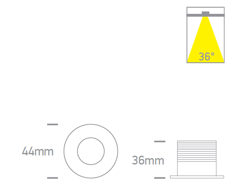 Stropní podhledové, bodové, svítidlo, těleso kov, povrch bílá/černá, LED 3W, 300lm, teplá 3000K, stmív, vyzař. úhel 36°, 350mA, IP20, tř.3, rozměry d=44mm, h=36mm, driver SAMOSTATNĚ.