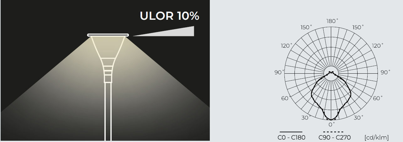 Nízké světelné znečištění ULOR 10% – optika v kombinaci s tvarem svítidla výrazně snižuje emise světla směrem nahoru.