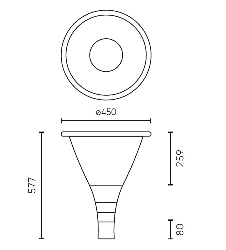 Rozměry hlavice d=450mm, h=577mm, montáž na stožár d=60mm. Uváděné rozměry jsou pouze informativní a výrobce je může změnit.