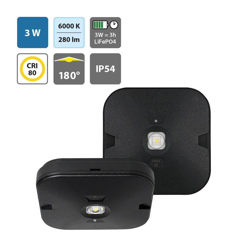 Stropní, přisazené nouzové svítidlo, plast černá, charakteristika OPEN AREA nebo CORRIDOR, SE - pouze nouzové svícení, LED 3W, 280lm, denní 6000K, záloha 3h, 230V, zvýšené krytí IP54, tř.2, 130x35x130mm.