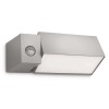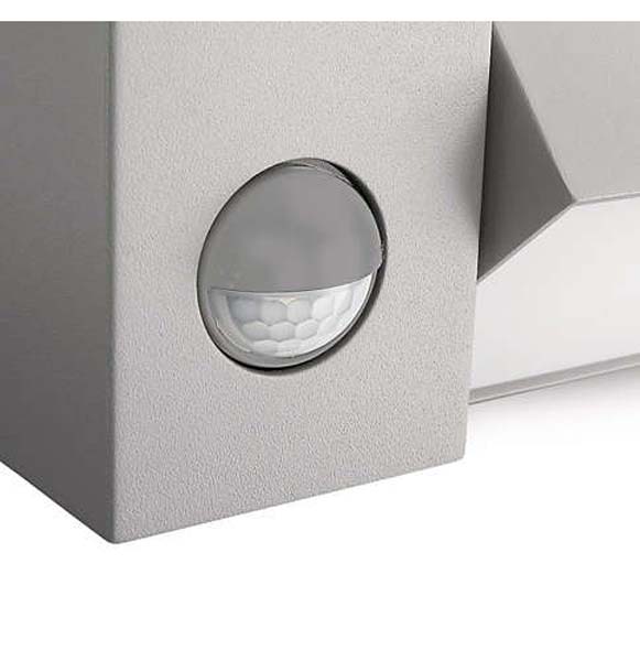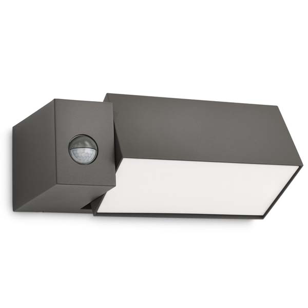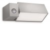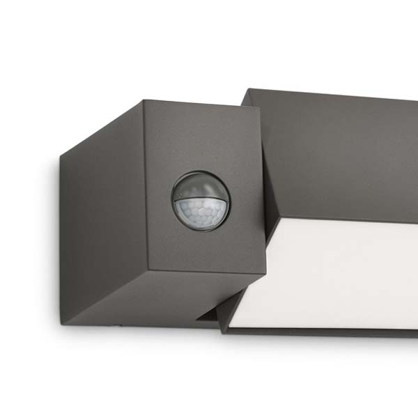 PIR - Nástěnné svítidlo, venkovní, senzor pohybu záběr 150°, čas 10s-10min, nastavitel sklon svíc, těleso hliník, šedostříbrná, šedočerná antracit, difuzor plast opál, 1x23W, E27, 230V, IP44, 93x268x155mm, vč úsp žá teplá 2700K.