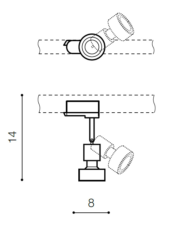Svítidlo do 3F lišty, nastavitelný směr svícení, těleso kov a hliník, povrch černá/bílá, pro žárovku 1x50W, GU10, 230V, IP20, rozměry d=80mm, h=140mm.