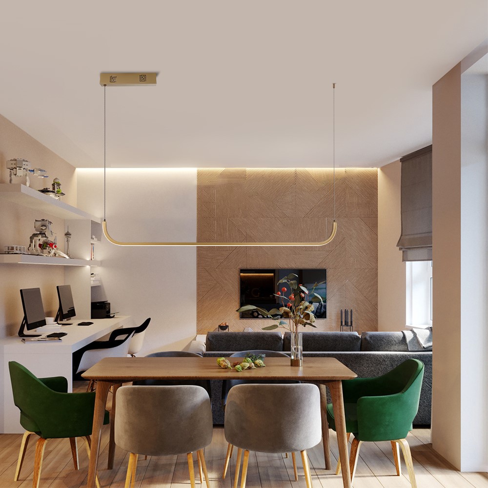 LED 26W Tuya ZigBee CCT - Závěsné svítidlo, kov, zlatá, dif plast opál, LED 26W, 1820lm, smart TUYA, Zigbee 3.0, dálk ovl. (souč.) nebo tel. CCT nast teplota teplá 3000K-denní 6000K, stmív, 1200x20mm, vč. záv. lank l=1500mm.