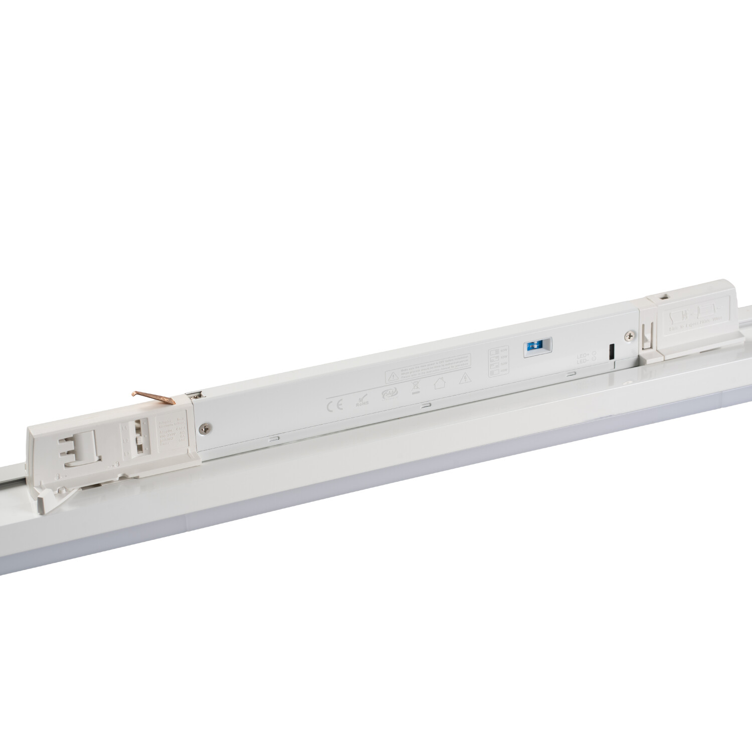 LED 60W/55W/50W/45W, CCT 3000K/4000K/5000K, 120° - Kolejnicové svítidlo, difuzor opál, LED, přep příkon 60W/55W/50W/45W, 10000lm, přepín CCT teplá 3000K/neutrální 4000K/denní 5000K,vyzař úh 120°, Ra80, 230V, IP20, rozměry 1500x60x56mm, do 3F lišty