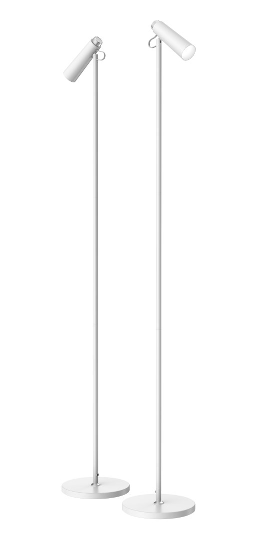 Stojací lampa, nastav. směr svícení, těleso kov, povrch černá/bílá se stříbrnými prvky, LED 6W, 200-400lm, přepín. CCT teplota teplá 3000K/neutr 4200K/denní 6000K, stmív., Ra80, 230V, IP20, rozměry d=200mm, h=1430mm.