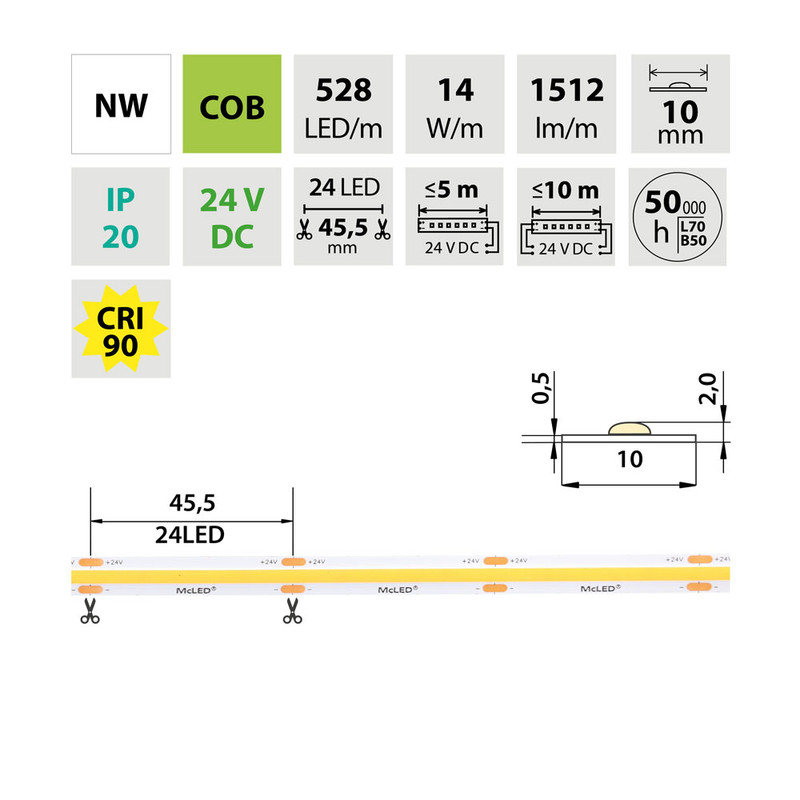 LED pásek COB, 528LED/m, 14W/m, 24V LED pásek - LED pásek, těleso plast, povrch bílá, COB 528LED/m, 14W/m, 1512lm/m, neutrální 4200K, vyzař úhel 150°, Ra90, 24V, IP20, w=10mm, l=5000mm, dělitelnost 45,5mm, cena za 1m