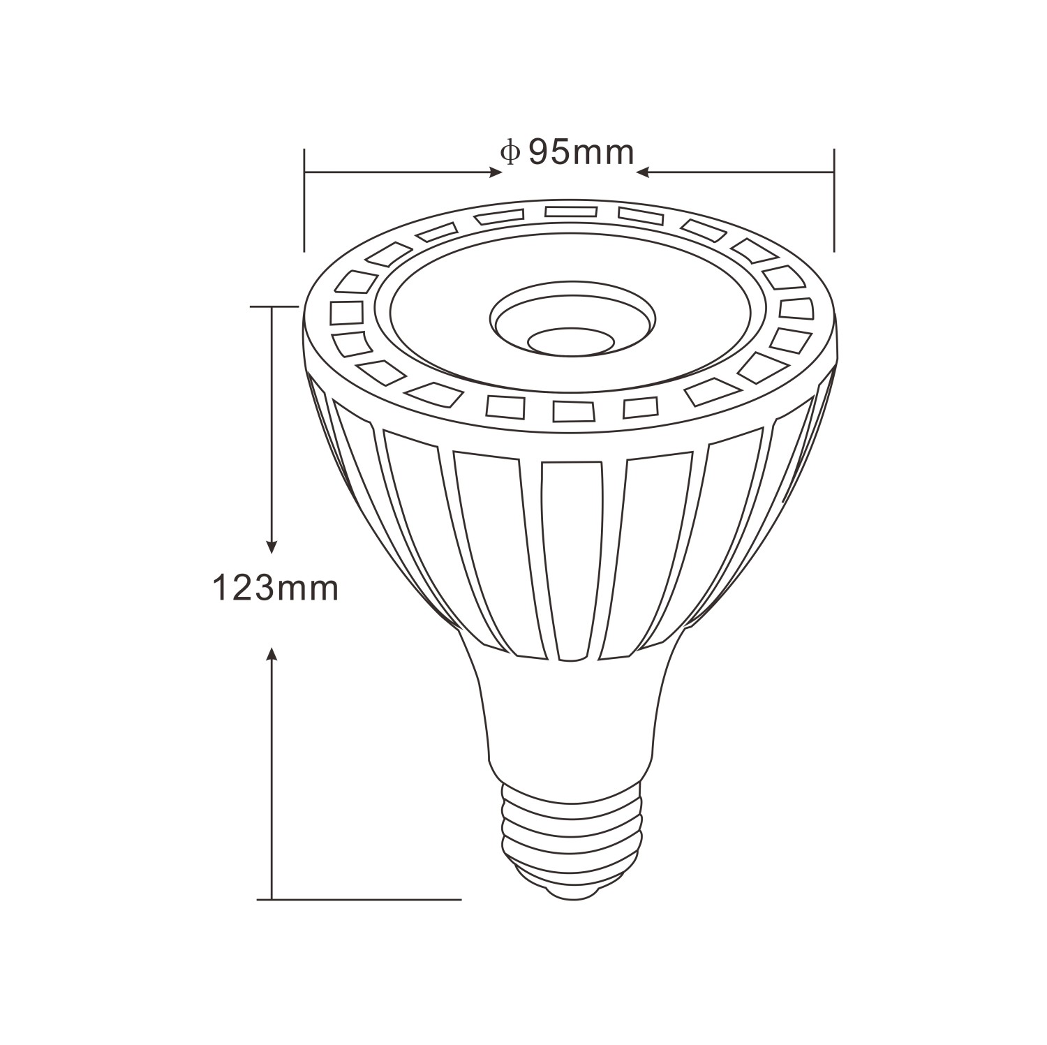 LED žárovka 20W E27, 3F, TRIAC - Světelný zdroj bodová LED žárovka, materiál hliník, povrch bílá, LED 20W, E27, PAR30, neutrální 4000K, 1650lm, stmív. TRIAC, Ra85, vyzař. úhel 24°, rozměry d=95mm, l=123mm.