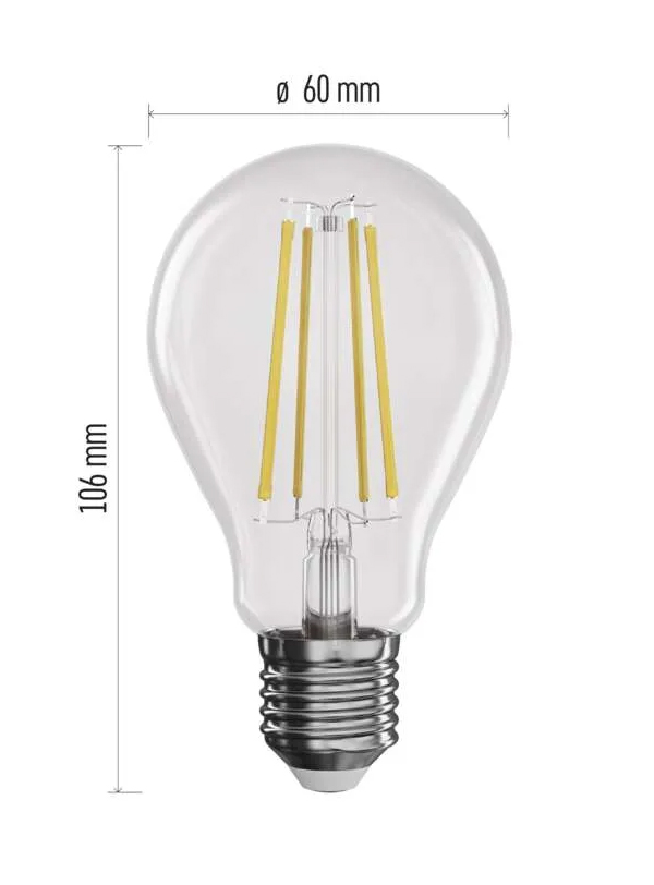 LED žárovka čirá E27 8,5W stmívatelná - Světelný zdroj, žárovka hrušková, sklo čiré, LED 8,5W, 1055lm, E27, A60, teplá 2700K, stmívatelná, 230V, d=60mm, l=106mm