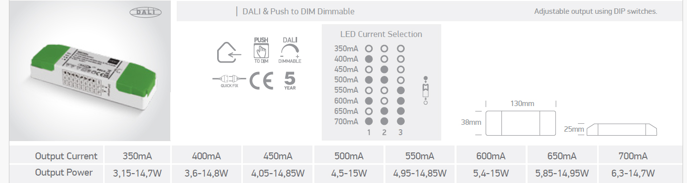 | Pomocí DIP přepínačů nasavitelný. výstupní proud | 350mA: 3,15-14,7W, 400mA: 3,6-14,8W, 450mA: 4,05-14,85W, 500mA: 4,5-15W, 550mA: 4,95-14,85W, 600mA: 5,4-15W, 650mA: 5,85-14,95W, 700mA: 6,3-14,7W |