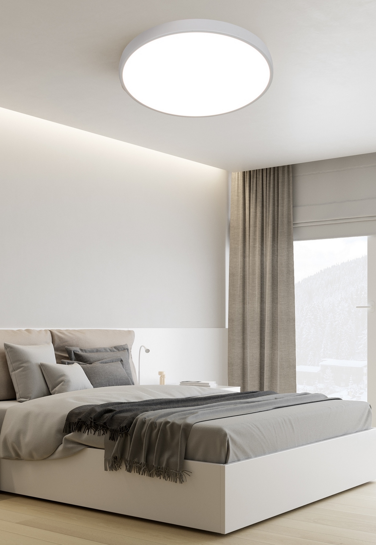 Stropní přisazené svítidlo, těleso kov a plast, povrch bílá/černá, difuzor plast opál, LED 36W, neutrální 4000K, 3600lm, Ra80, 230V, IP20, rozměry d=400mm, h=50mm.