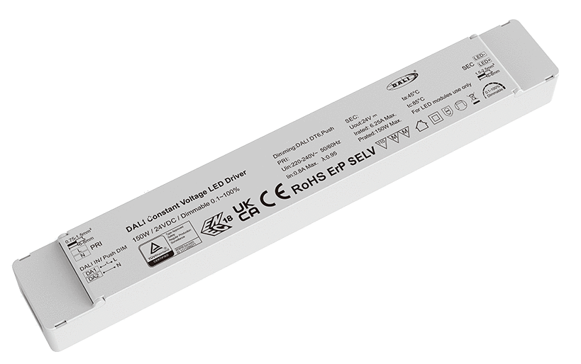 Stmínvatelný napákecí zdroj pro LED, flickerfree, vstup 230V, výstup 12V/12,5A, nebo 24V/6,25A, 150W, 12,5A, stmívatelný DALI/PUSH, 1-100%, IP20, rozměry 310x45x30mm, ochrana proti zkratu, přehřátí a přetížení