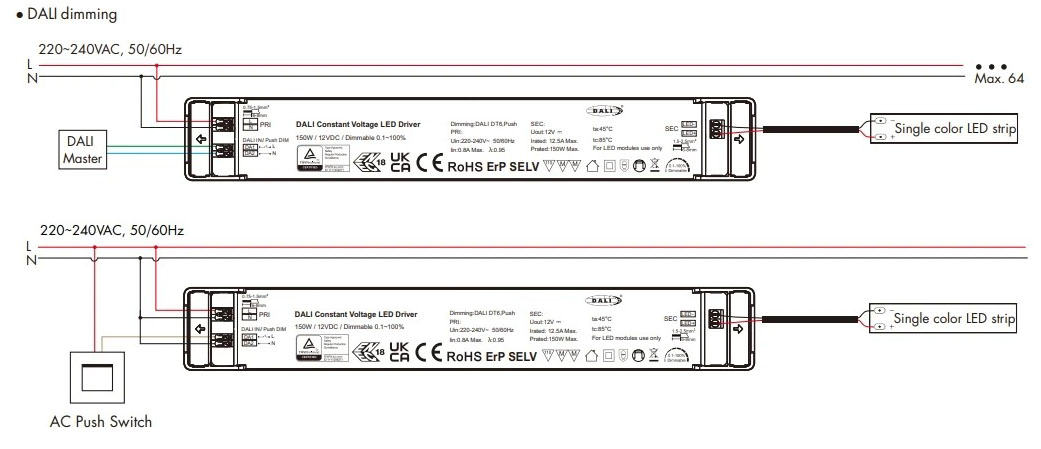 | Výhodné vlastnosti | All in One - Vše v jednom - Zařízení obsahuje napájecí zdroj, flickerfree stmívač, zesilovač. Možnost provozu DALI i tlačítkem PUSH switchDim |