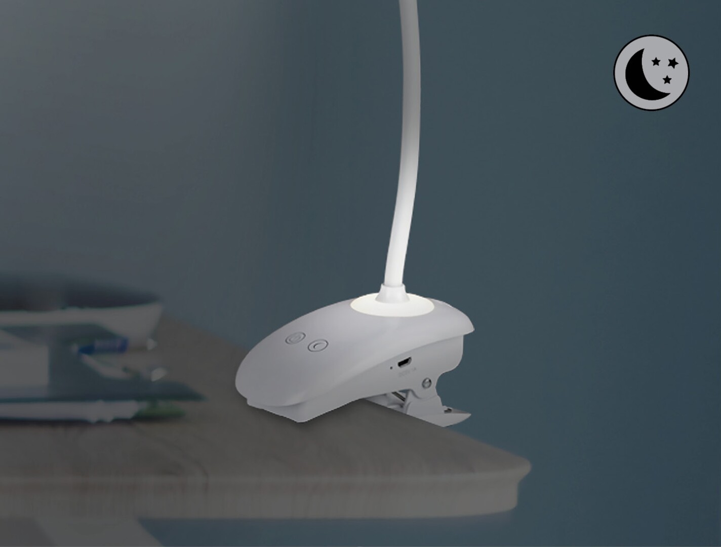 ECLIPTA 4W - Stolní lampa s klipem, skřipcem, nastav, směr svícení, těleso plast bílá, LED 4W, neutrální 4000K, 180lm, stmív. dotyk spínačem, 230V, IP20, tř.2, rozměry 60x470mm.