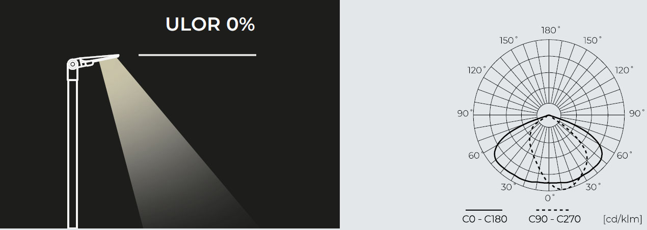 Žádné světelné znečištění – svítidlo má faktor ULOR 0 %, což znamená žádné oslnění ani ztráty světla v podobě světelného smogu.