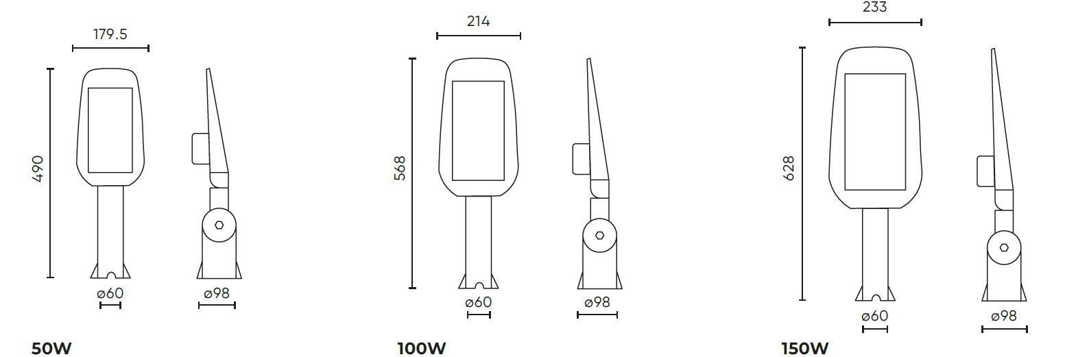 Svítidlo pro veřejné osvětlení, nastav. sklon svícení, těleso hliník, povrch šedá/černá, LED 50W/100W/150W, neutrální 4000K, ULOR 0% 230V, IP65, rozměry dle typu, mont na výložník d=60mm