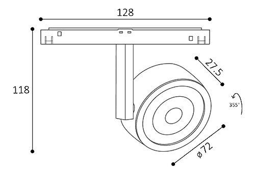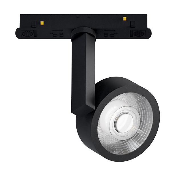 - Bodové svítidlo do magnetického systému, reflektor, nast. směr svícení, těleso kov, povrch černá, LED 8W, 480lm, teplá 3000K, 48V, IP20, rozměry d=72mm, h=118mm.