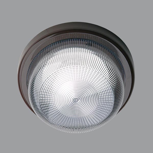 Stropní svítidlo, základna polykarbonát, barva bílá/hnědá, kryt polykarbonát čirý s drážkami, pro žárovku 1x60W/E27, nebo LED, 230V, IP53, zař. tř.2, d=220mm, h=105mm