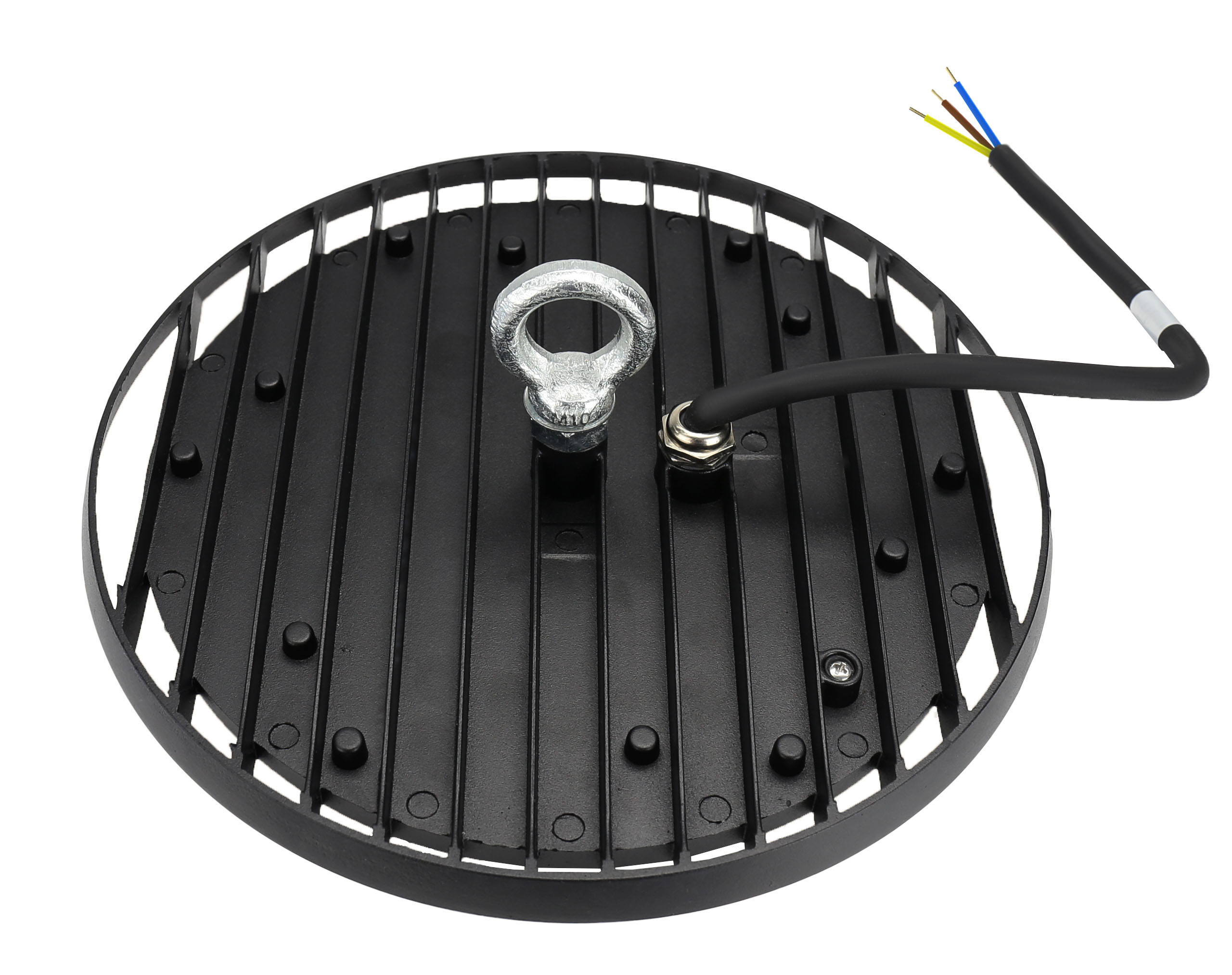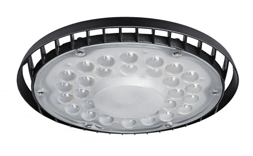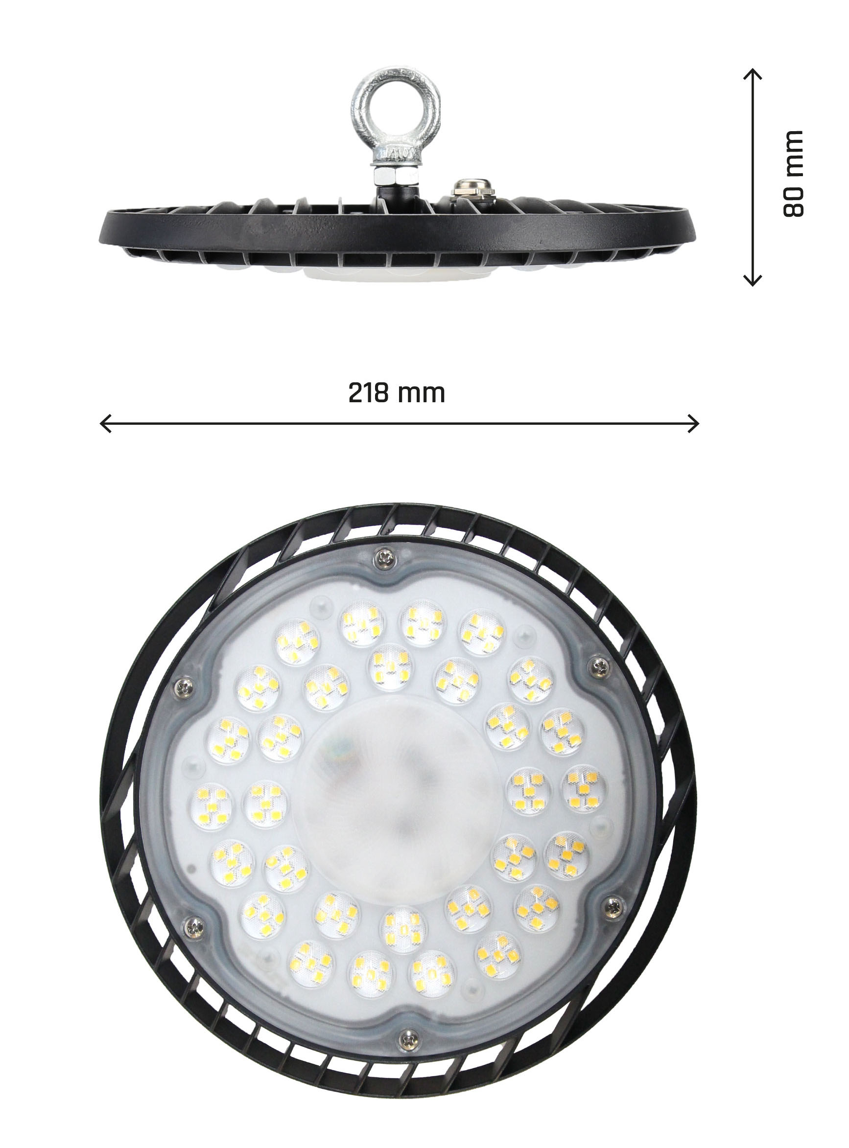 UFOLIGHT 105W, IP65 - Závěsné průmyslové svítidlo, těleso kov, povrch černá, krycí plast čirý, LED 105W, 11550lm, neutrální 4000K, vyzař. úhel 70°, Ra80, 230V, IP65, IK06, rozměry d=218, h=80mm