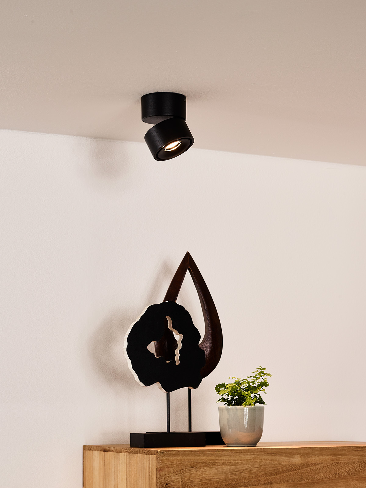 Stropní přisazené svítidlo, nastavitelný směr svícení, těleso kov, povrch černá/bílá, LED 8W, 626,8lm, teplá 2700K, stmívatelné, 230V, IP20, tř. 2, rozměry: d=78mm, h=82mm.