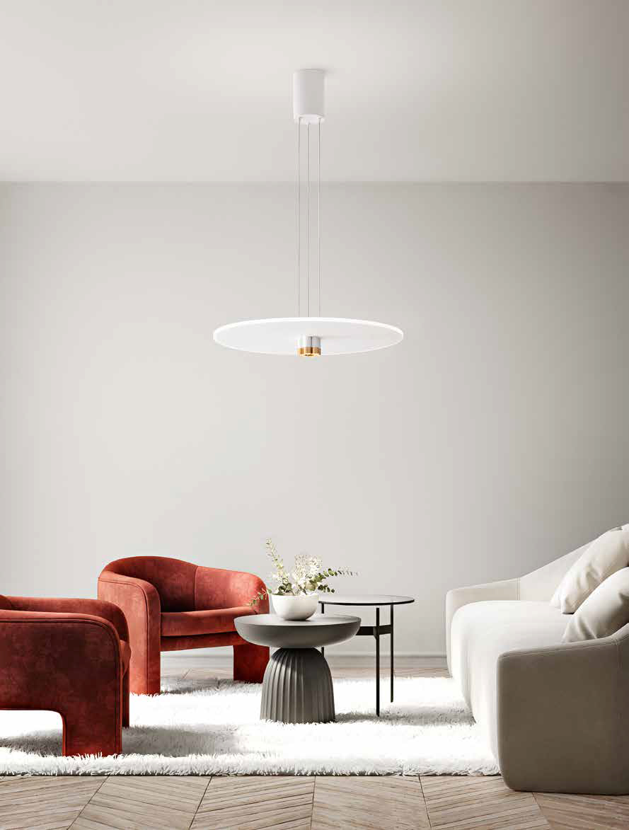 Závěsné svítidlo, lustr, těleso hliník, povrch broušená zlatá + bílá/černá, dif plast opál, LED 50W, 3500lm, teplá 3000K, stmív, Ra80, 230V, IP20, tř.1, rozměry d=710mm, h=90mm, vč závěs lanka l=2260mm, lze zkr, svítí nahoru/dolů